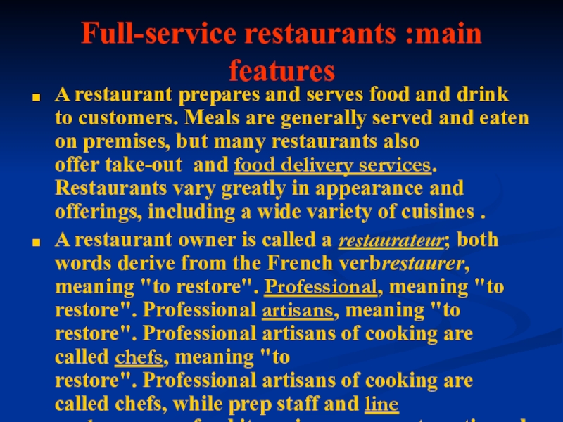 A restaurant owner is called a restaurateur; both words derive from the French verbrestaurer, meaning "to restore". Professional, meaning "to restore". Professional artisans, meaning "to restore". Professional artisans of cooking are called chefs, meaning "to restore". Professional artisans of cooking are called chefs, while prep staff and line cooks prepare food items in a more systematic and less artistic fashion.