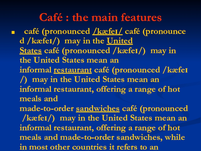 the United States mean an informal restaurant café (pronounced /kæfeɪ/) may in the United States mean an informal restaurant, offering a range of hot meals and made-to-order sandwiches café (pronounced /kæfeɪ/) may in the United States mean an informal restaurant, offering a range of hot meals and made-to-order sandwiches, while in most other countries it refers to an establishment which focuses on serving coffee café (pronounced /kæfeɪ/) may in the United States mean an informal restaurant, offering a range of hot meals and made-to-order sandwiches, while in most other countries it refers to an establishment which focuses on serving coffee, like an American coffee café (pronounced /kæfeɪ/) may in the United States mean an informal restaurant, offering a range of hot meals and made-to-order sandwiches, while in most other countries it refers to an establishment which focuses on serving coffee, like an American coffee café (pronounced /kæfeɪ/) may in the United States mean an informal restaurant, offering a range of hot meals and made-to-order sandwiches, while in most other countries it refers to an establishment which focuses on serving coffee, like an American coffee house.