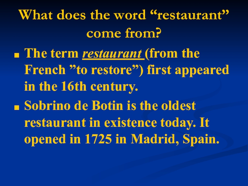 Sobrino de Botin is the oldest restaurant in existence today. It opened in 1725 in Madrid, Spain.