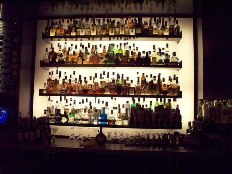 The term "bar" is derived from the specialized counter on which drinks are served. The "back bar" or "gantry" is a set of shelves of glasses and bottles behind that counter. In some bars, the gantry is elaborately decorated with woodwork, etched glass, mirrors, and lights.