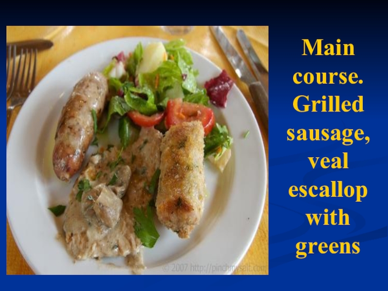 Слайд 9Main course. Grilled sausage, veal escallop with greens
