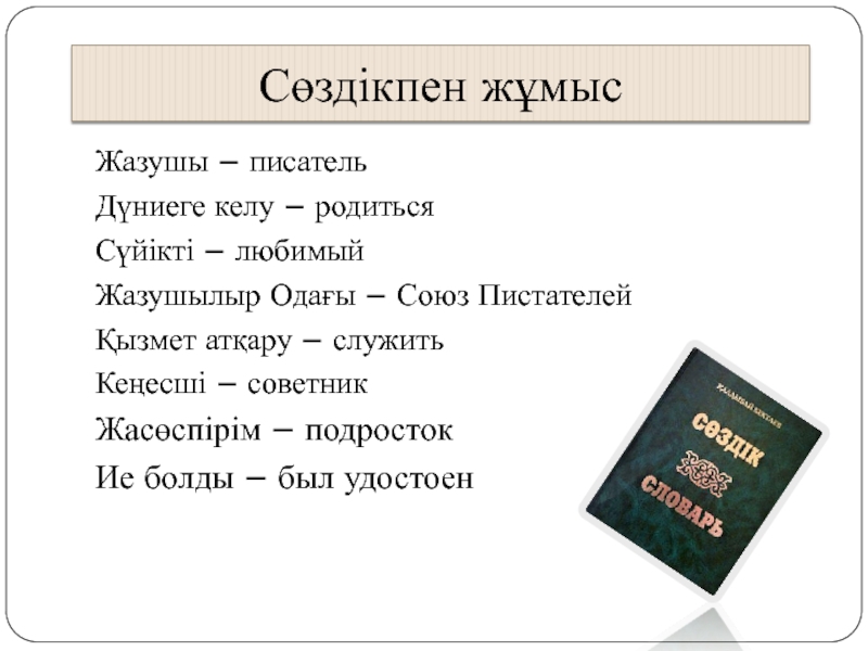 Сөздікпен жұмысЖазушы – писатель Дүниеге келу – родиться Сүйікті – любимый Жазушылыр Одағы – Союз ПистателейҚызмет атқару