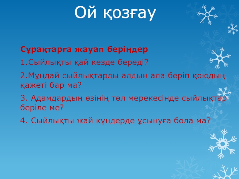 Ой қозғауСұрақтарға жауап беріңдер1.Сыйлықты қай кезде береді?2.Мұндай сыйлықтарды алдын ала беріп қоюдың