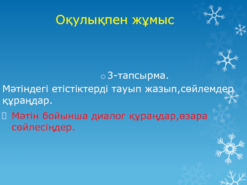 Оқулықпен жұмыс3-тапсырма.Мәтіндегі етістіктерді тауып жазып,сөйлемдер құраңдар.Мәтін бойынша диалог құраңдар,өзара сөйлесіңдер.