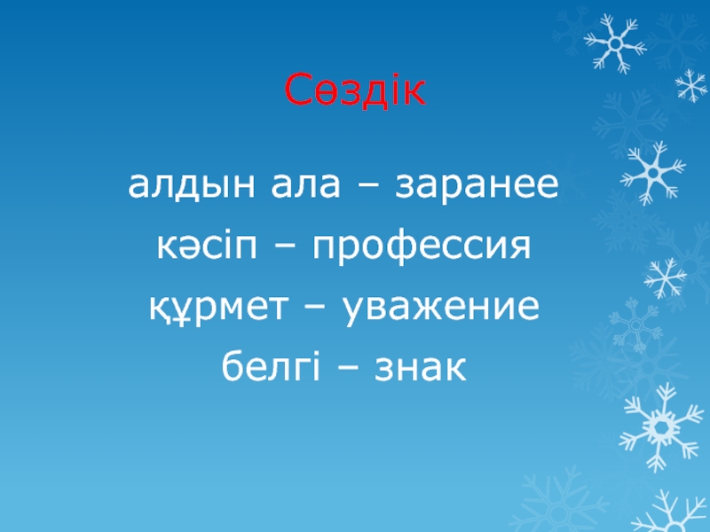 Сөздік алдын ала – заранеекәсіп – профессияқұрмет – уважениебелгі – знак