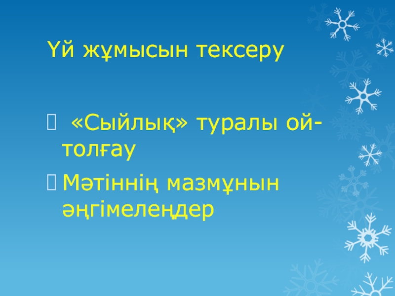 Үй жұмысын тексеру «Сыйлық» туралы ой-толғауМәтіннің мазмұнын әңгімелеңдер