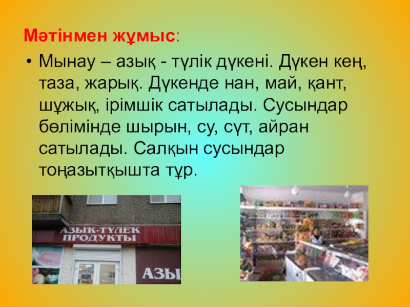 Мынау – азық - түлік дүкені. Дүкен кең, таза, жарық.