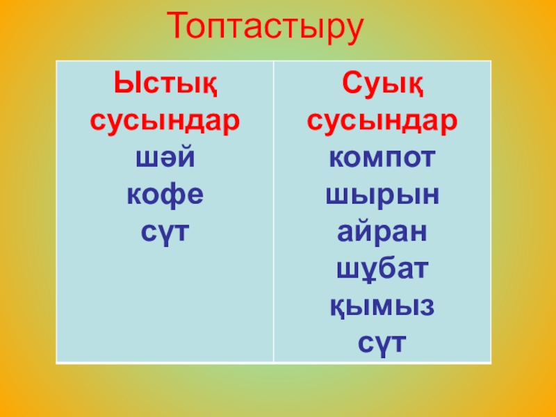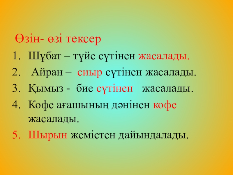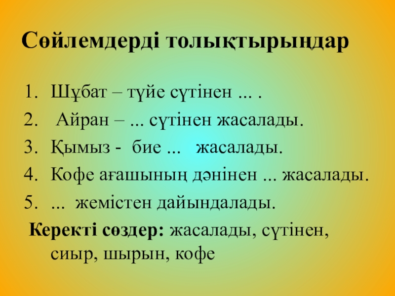 Керекті сөздер: жасалады, сүтінен, сиыр, шырын, кофе