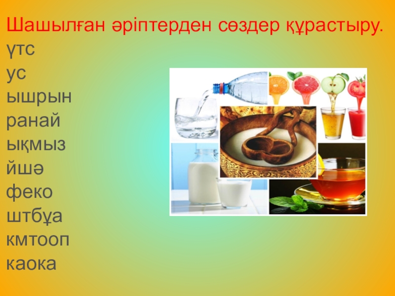 Слайд 6Шашылған әріптерден сөздер құрастыру.