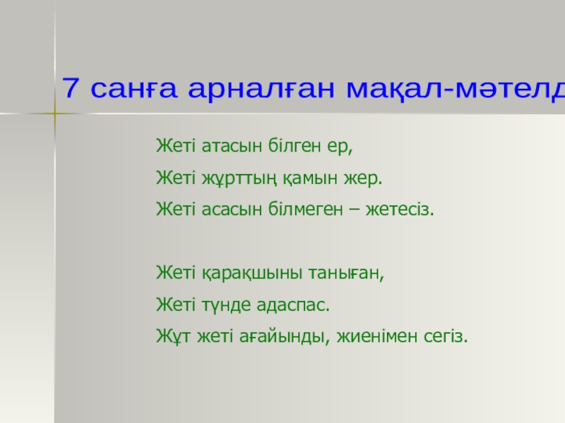 7 санға арналған мақал-мәтелдер: Жеті атасын білген ер,Жеті жұрттың қамын жер.Жеті асасын білмеген – жетесіз.Жеті қарақшыны таныған,Жеті