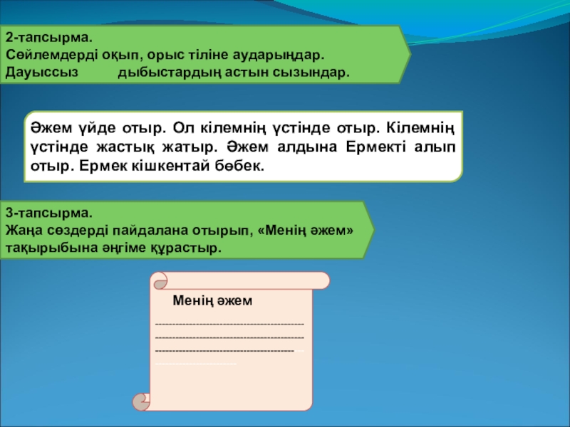 Әжем үйде отыр. Ол кілемнің үстінде отыр. Кілемнің үстінде жастық жатыр. Әжем алдына Ермекті алып отыр. Ермек кішкентай бөбек.