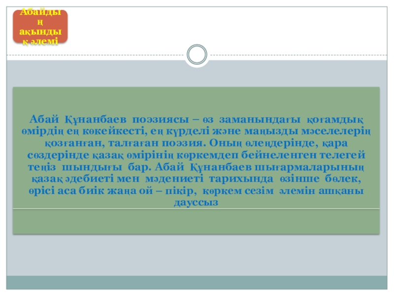 ақын екені, таңдаулы туындылары дүние жүзі поэзияның озат үлгілермен деңгейлес тұрғаны білген адамға айқын шындық. Сан ғасырлық бай поэзиясы, ел қамын жоқтаған жүздеген өрен жүйрік жырау, жыршы, ақындары бар әдебиетте Абайдай ұлы ақын дүниеге келуінде өзіндік заңдылық бар.