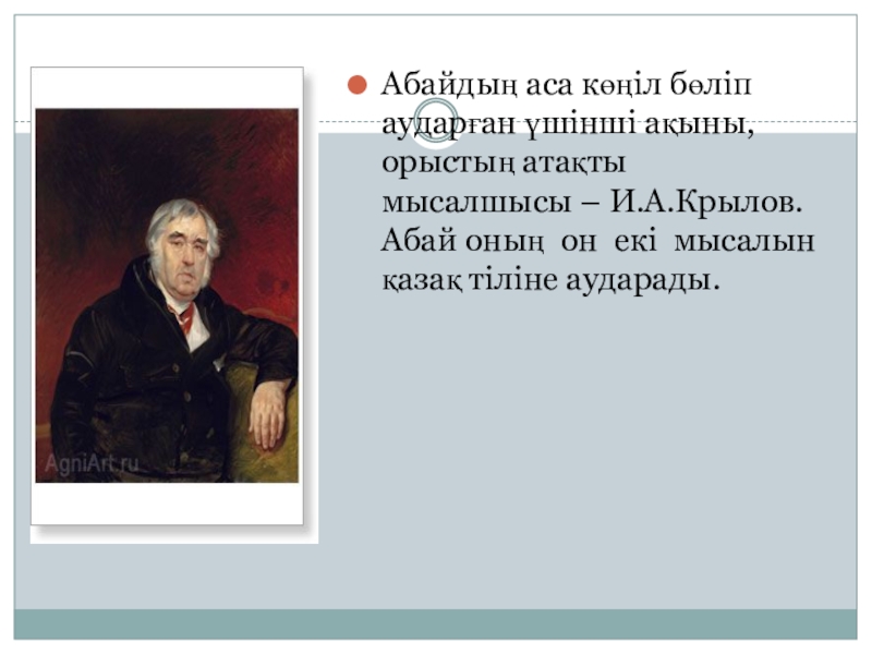 Слайд 19Абайдың аса көңіл бөліп аударған үшінші ақыны, орыстың атақты мысалшысы –