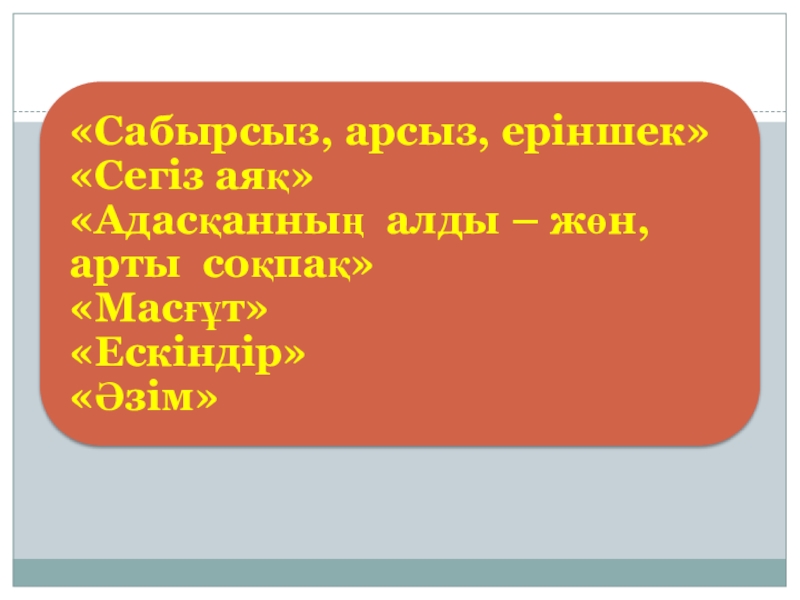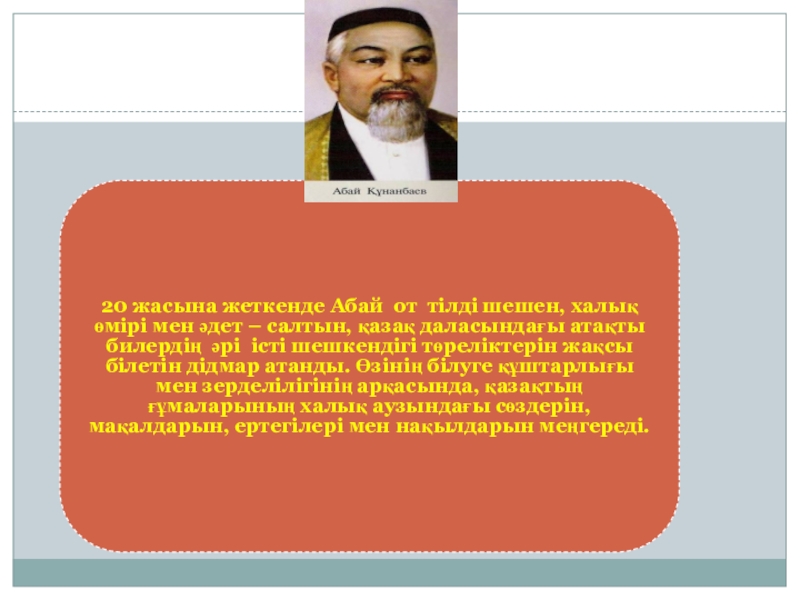 Слайд 20Бұл аудармаларында да Абай шеберліктің, дәлдіктің, авторды терең түсінудің үлгілерін көрсете