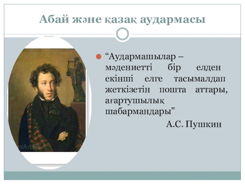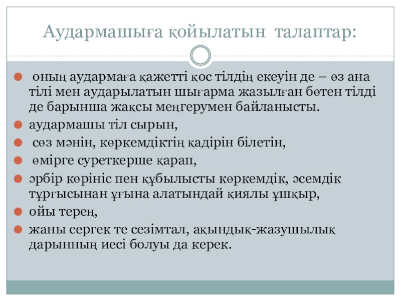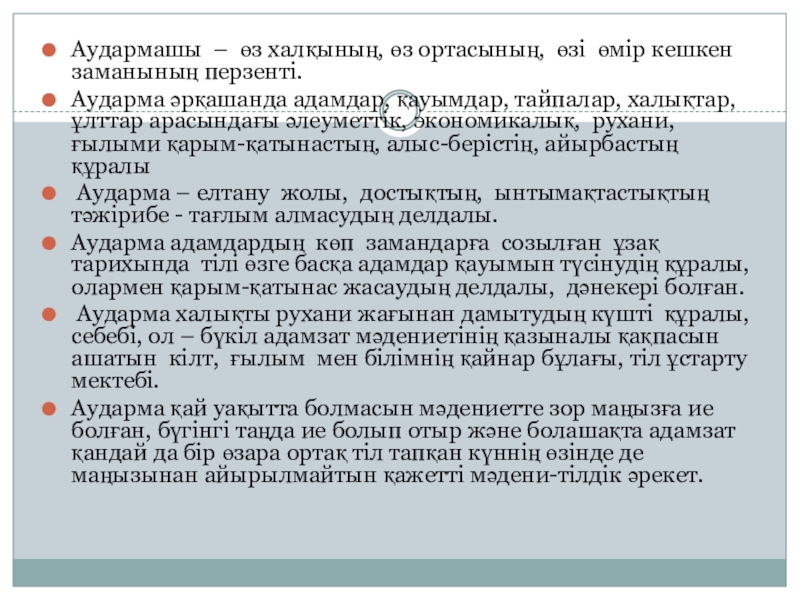 Слайд 17Аудармашы – өз халқының, өз ортасының, өзі өмір кешкен заманының перзенті.