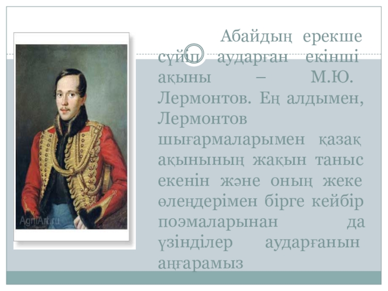 М.Ю. Лермонтов. Ең алдымен, Лермонтов шығармаларымен қазақ ақынының жақын таныс екенін және оның жеке өлеңдерімен бірге кейбір поэмаларынан да үзінділер аударғанын аңғарамыз
