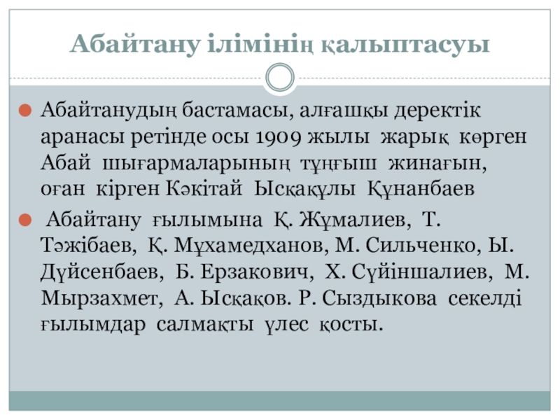 Абайтану ғылымына Қ. Жұмалиев, Т. Тәжібаев, Қ. Мұхамедханов, М. Сильченко, Ы. Дүйсенбаев, Б. Ерзакович, Х. Сүйіншалиев, М. Мырзахмет, А. Ысқақов. Р. Сыздыкова секелді ғылымдар салмақты үлес қосты.