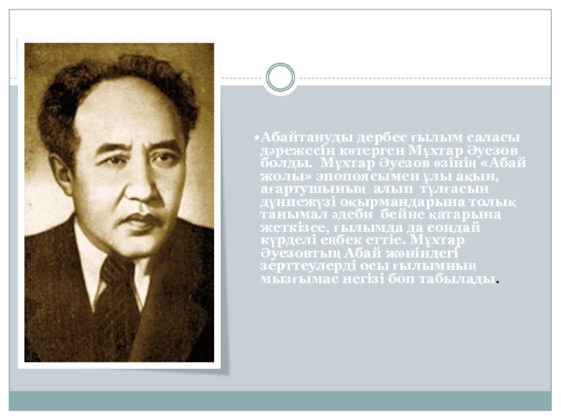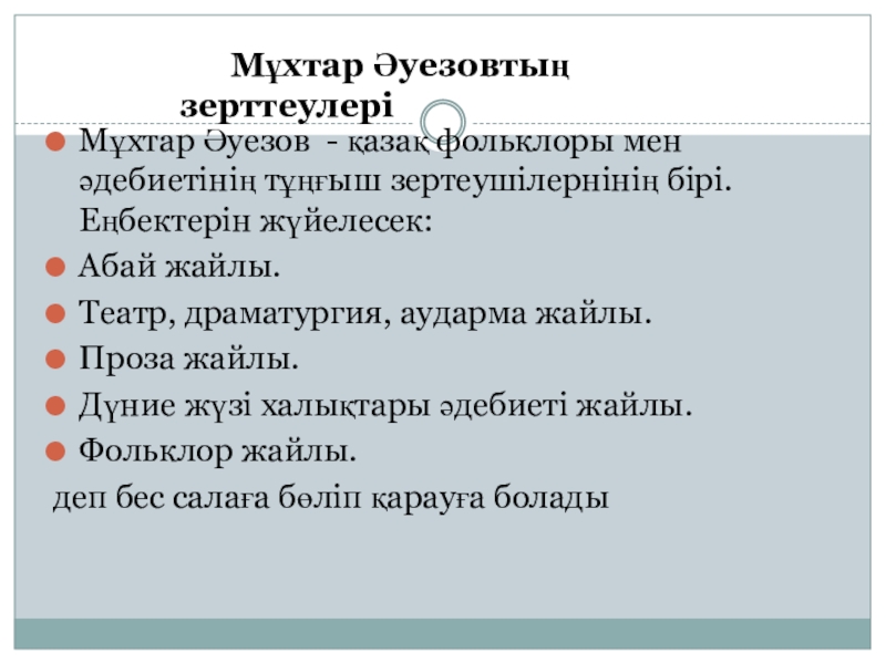 Слайд 12Мұхтар Әуезов - қазақ фольклоры мен әдебиетінің тұңғыш зертеушілернінің бірі. Еңбектерін