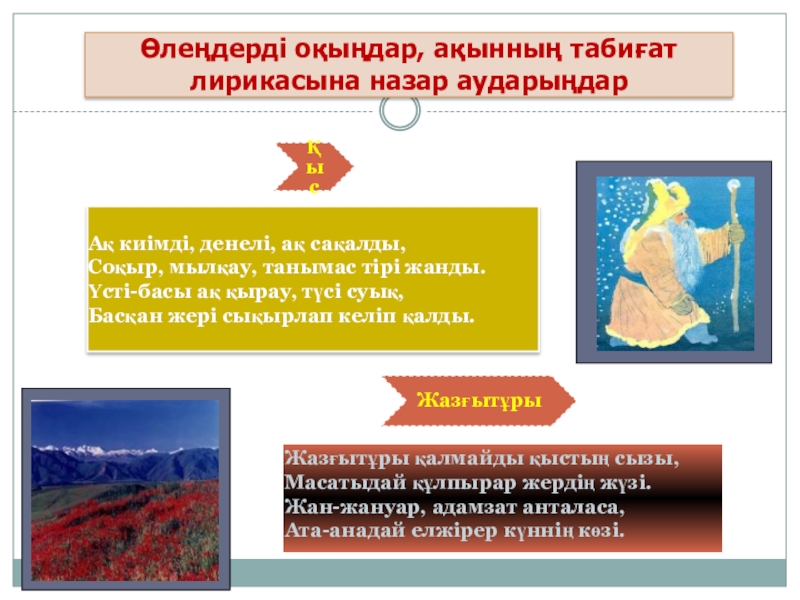 Слайд 10Өлеңдерді оқыңдар, ақынның табиғат лирикасына назар аударыңдар