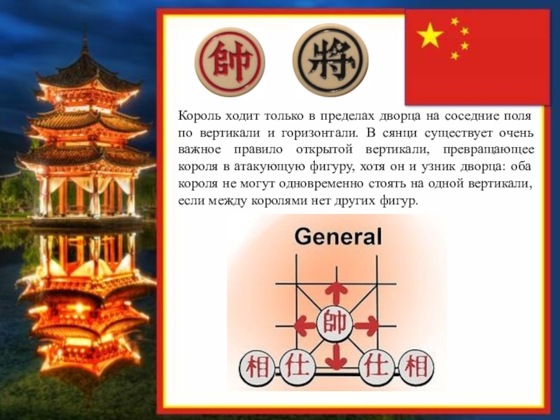 и горизонтали. В сянци существует очень важное правило открытой вертикали, превращающее короля в атакующую фигуру, хотя он и узник дворца: оба короля не могут одновременно стоять на одной вертикали, если между королями нет других фигур.