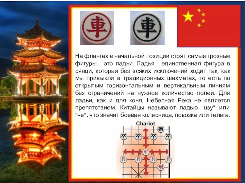 ладьи. Ладья - единственная фигура в сянци, которая без всяких исключений ходит так, как мы привыкли в традиционных шахматах, то есть по открытым горизонтальным и вертикальным линиям без ограничений на нужное количество полей. Для ладьи, как и для коня, Небесная Река не является препятствием. Китайцы называют ладью "цзу" или "че", что значит боевая колесница, повозка или телега.