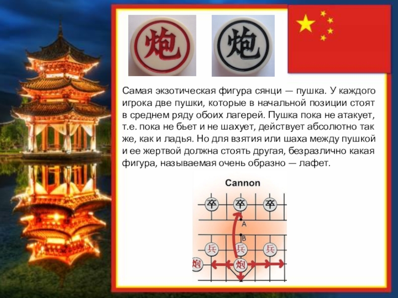Слайд 20Самая экзотическая фигура сянци — пушка. У каждого игрока две пушки,