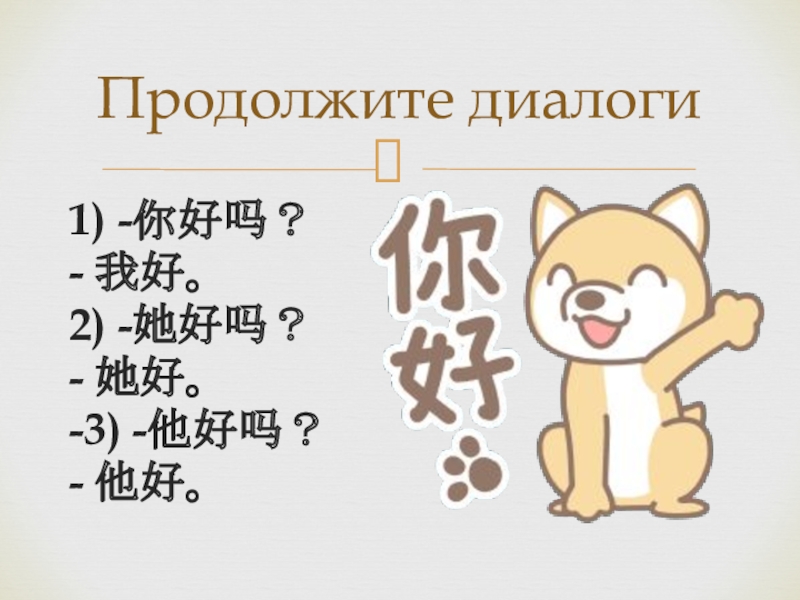 1) -你好吗?- 我好。2) -她好吗?- 她好。-3) -他好吗?- 他好。Продолжите диалоги