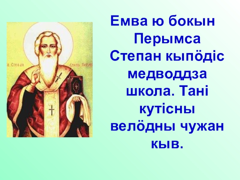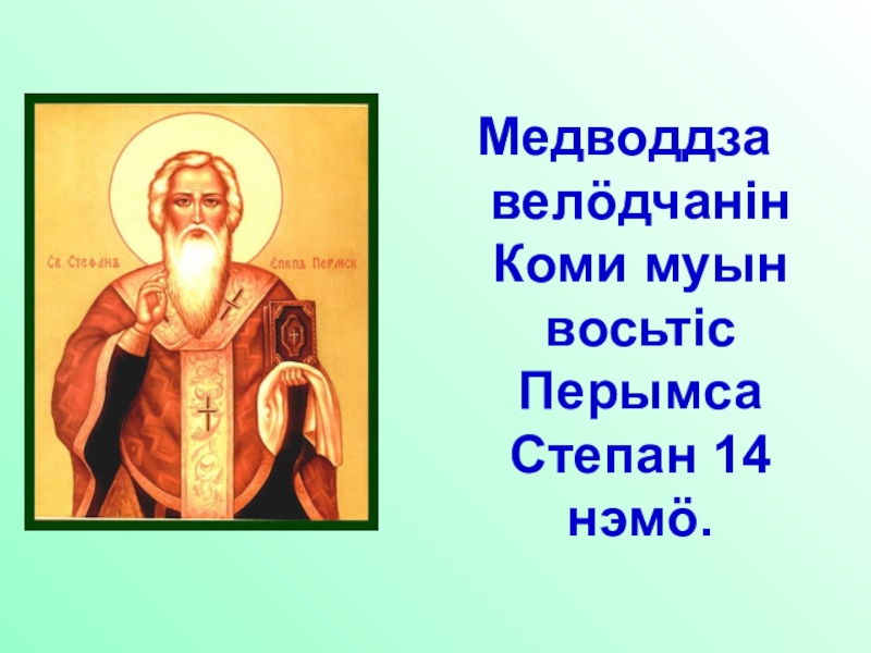 Слайд 2Медводдза велӧдчанiн Коми муын восьтiс Перымса Степан 14 нэмӧ.