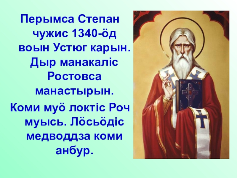 Слайд 3Перымса Степан чужис 1340-ӧд воын Устюг карын. Дыр манакалiс Ростовса манастырын.