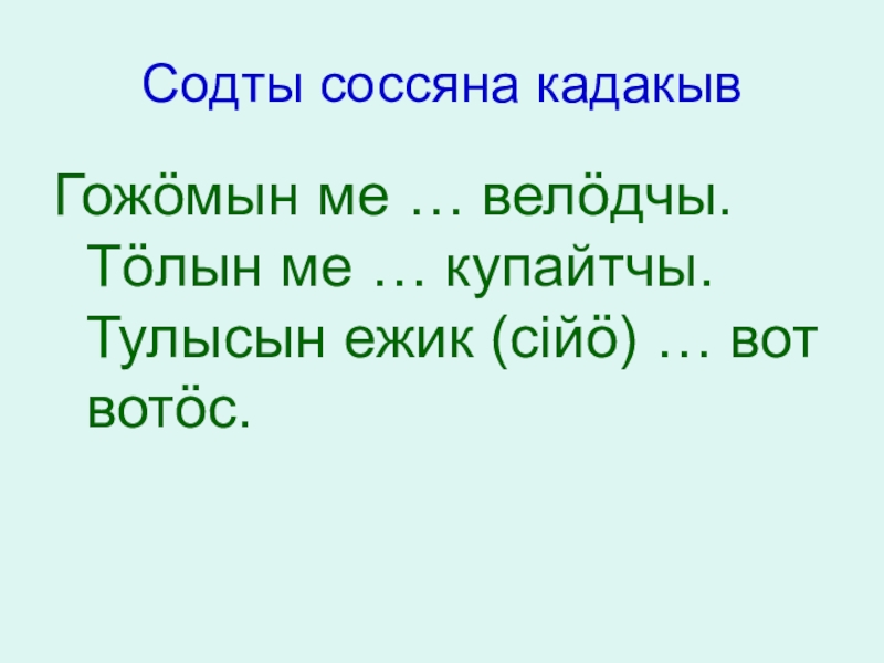 Содты соссяна кадакывГожӧмын ме … велӧдчы. Тӧлын ме … купайтчы. Тулысын ежик (сiйӧ) … вот вотӧс.
