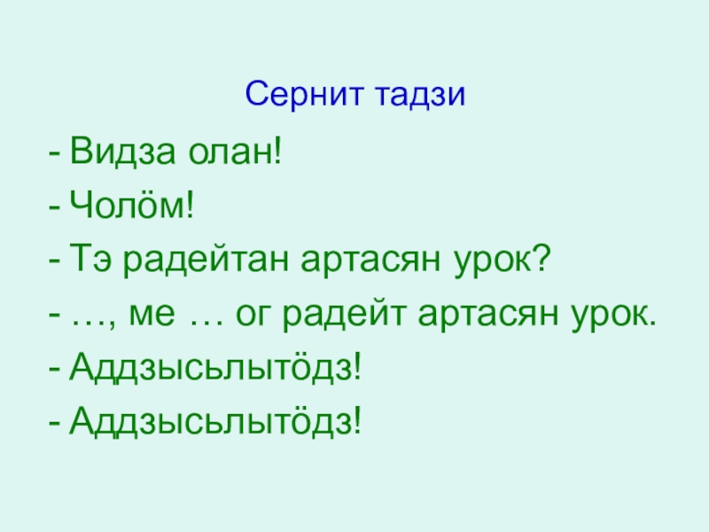 Сернит тадзиВидза олан!Чолӧм!Тэ радейтан артасян урок?…, ме … ог радейт артасян урок.Аддзысьлытӧдз!Аддзысьлытӧдз!