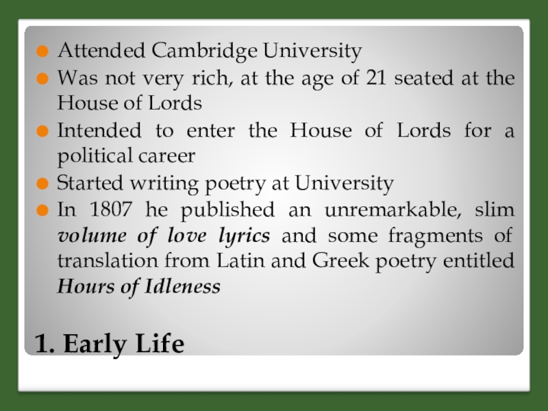 In 1807 he published an unremarkable, slim volume of love lyrics and some fragments of translation from Latin and Greek poetry entitled Hours of Idleness