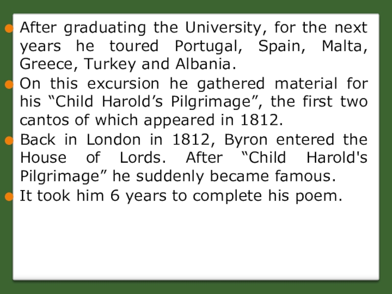 On this excursion he gathered material for his “Child Harold’s Pilgrimage”, the first two cantos of which appeared in 1812.