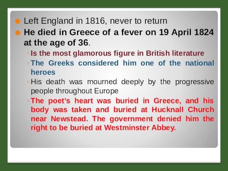 The poet’s heart was buried in Greece, and his body was taken and buried at Hucknall Church near Newstead. The government denied him the right to be buried at Westminster Abbey.