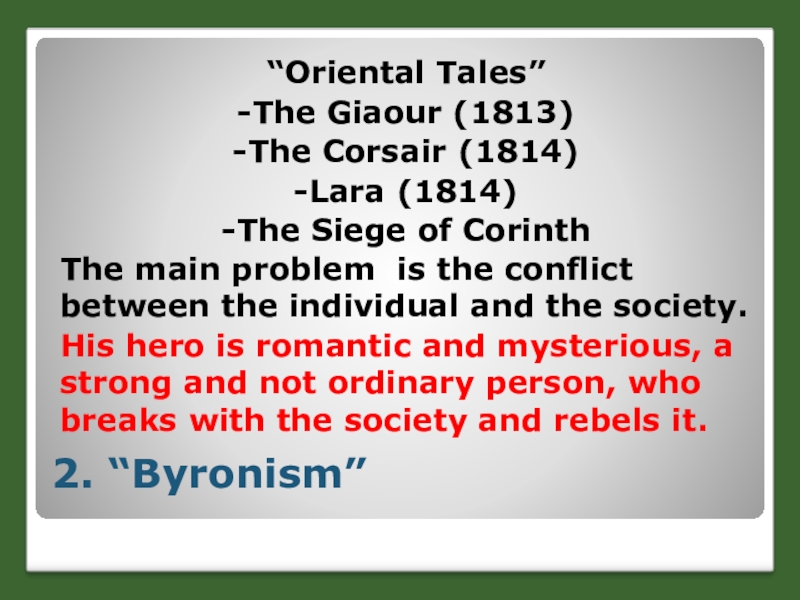 His hero is romantic and mysterious, a strong and not ordinary person, who breaks with the society and rebels it.