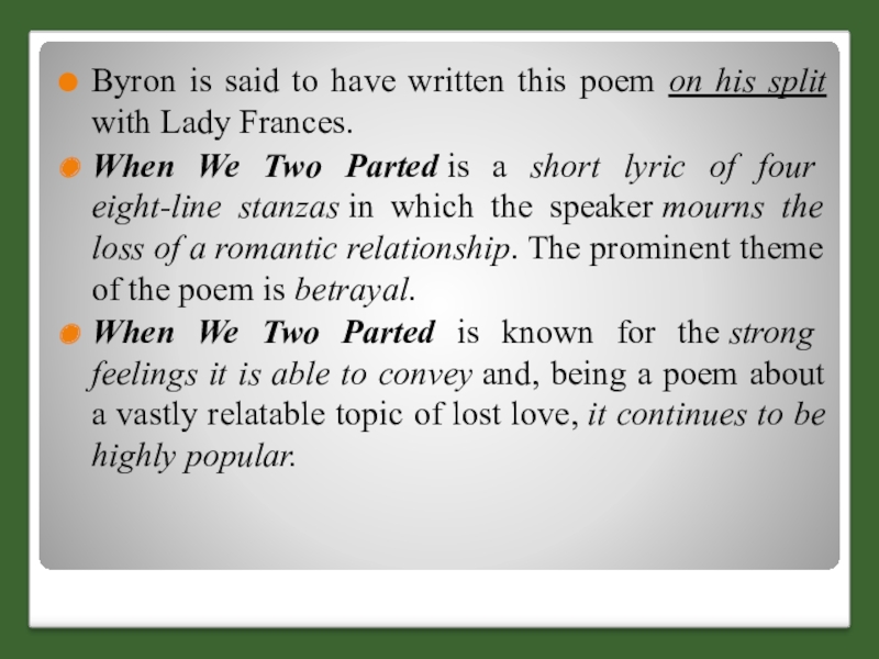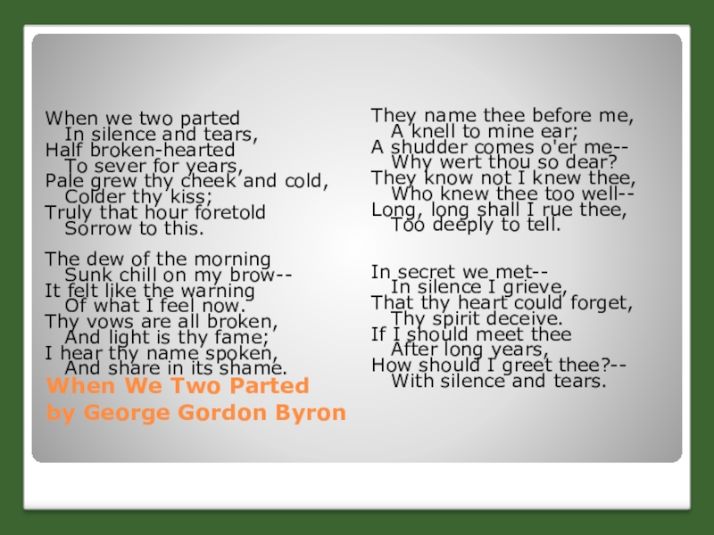 When We Two Parted is a short lyric of four eight-line stanzas in which the speaker mourns the loss of a romantic relationship. The prominent theme of the poem is betrayal.