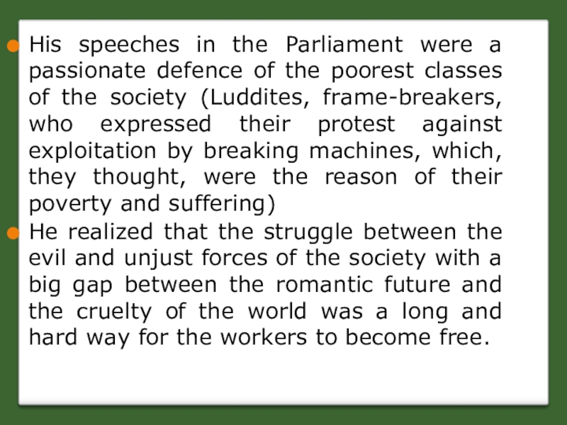 He realized that the struggle between the evil and unjust forces of the society with a big gap between the romantic future and the cruelty of the world was a long and hard way for the workers to become free.
