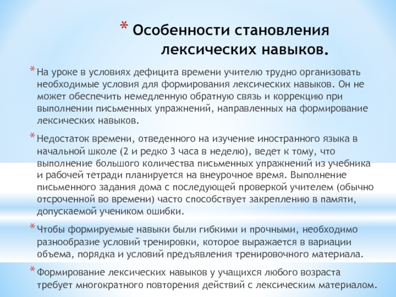 организовать необходимые условия для формирования лексических навыков. Он не может обеспечить немедленную обратную связь и коррекцию при выполнении письменных упражнений, направленных на формирование лексических навыков.
