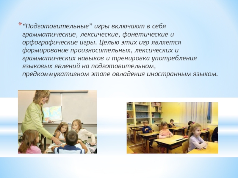 Слайд 15“Подготовительные” игры включают в себя грамматические, лексические, фонетические и орфографические игры.