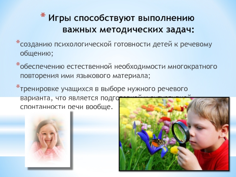 Слайд 13Игры способствуют выполнению важных методических задач: