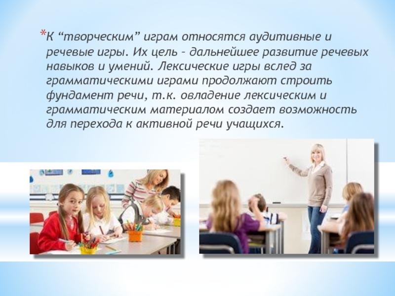 Слайд 16К “творческим” играм относятся аудитивные и речевые игры. Их цель –