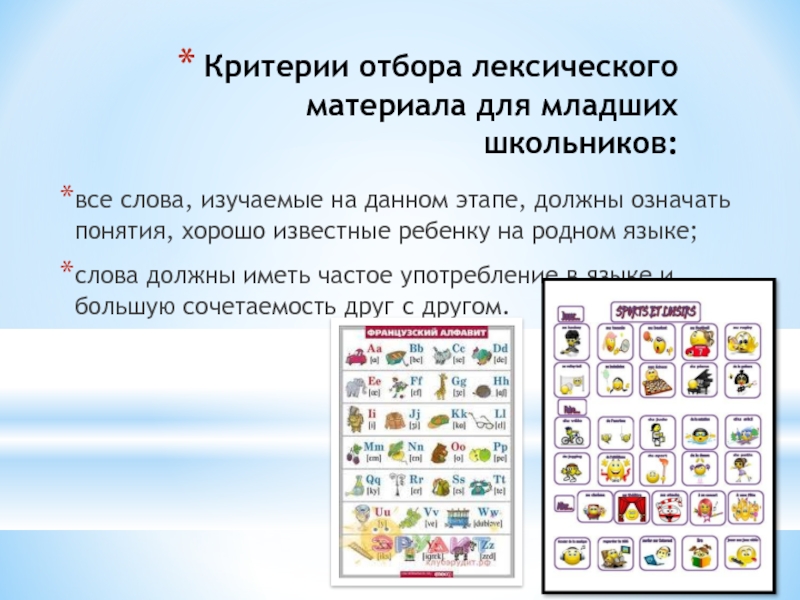 Слайд 5Критерии отбора лексического материала для младших школьников: