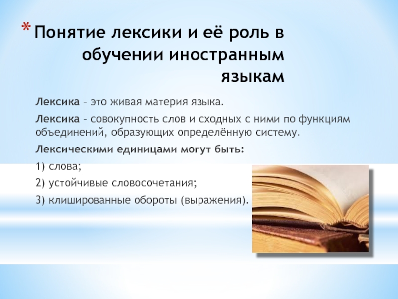 Слайд 2Понятие лексики и её роль в обучении иностранным языкам
