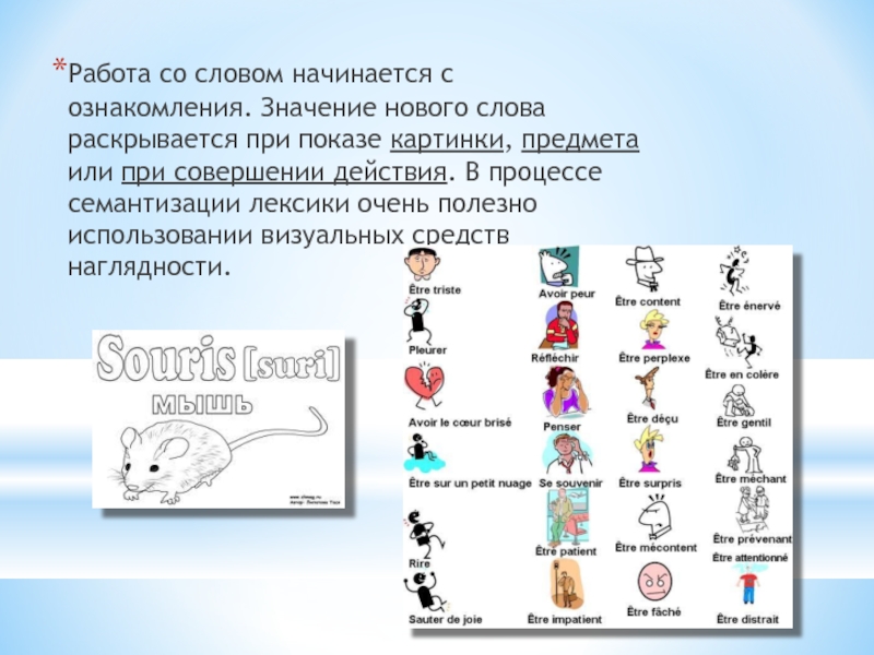 показе картинки, предмета или при совершении действия. В процессе семантизации лексики очень полезно использовании визуальных средств наглядности.