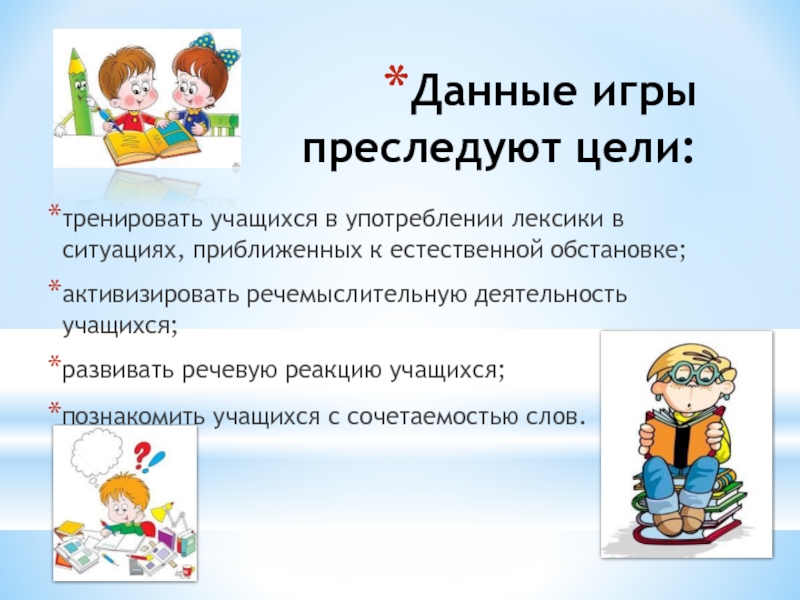 дальнейшее развитие речевых навыков и умений. Лексические игры вслед за грамматическими играми продолжают строить фундамент речи, т.к. овладение лексическим и грамматическим материалом создает возможность для перехода к активной речи учащихся.
