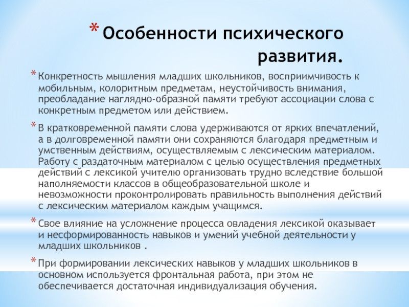 При формировании лексических навыков у младших школьников в основном используется фронтальная работа, при этом не обеспечивается достаточная индивидуализация обучения.