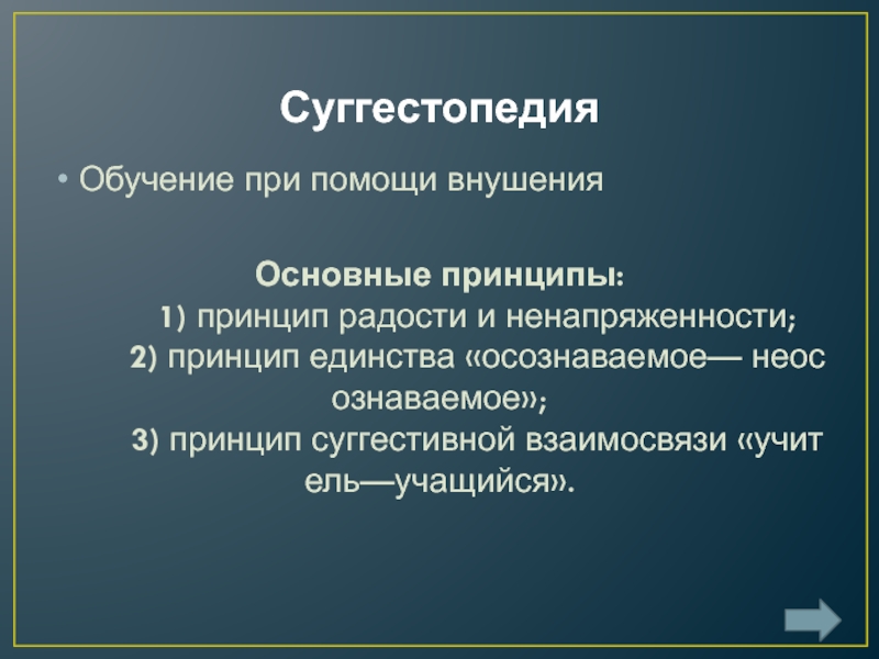 СуггестопедияОбучение при помощи внушенияОсновные принципы:         1) принцип радости и ненапряженности;         2) принцип единства «осознаваемое— неосознаваемое»;         3) принцип суггестивной взаимосвязи «учитель—учащийся».