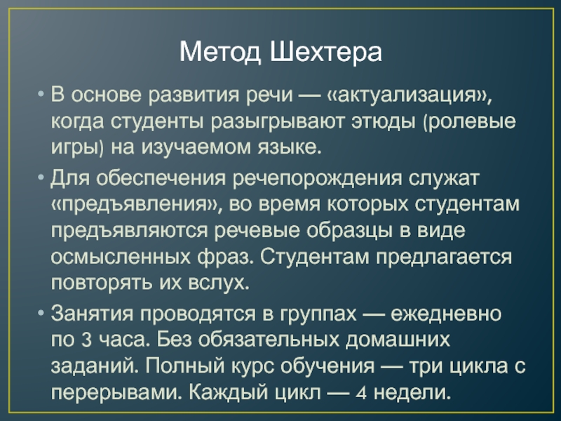 Метод ШехтераВ основе развития речи — «актуализация», когда студенты разыгрывают этюды (ролевые игры) на изучаемом языке.Для обеспечения речепорождения