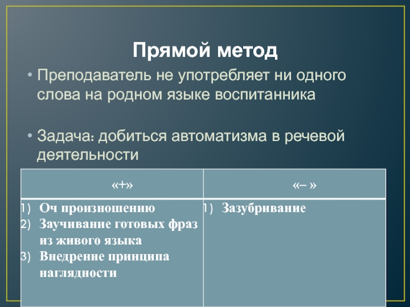 Прямой методПреподаватель не употребляет ни одного слова на родном языке воспитанникаЗадача: добиться автоматизма в речевой деятельности