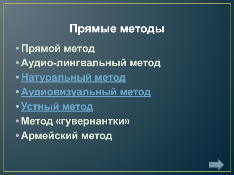 Прямые методыПрямой методАудио-лингвальный метод Натуральный методАудиовизуальный методУстный метод Метод «гувернантки»Армейский метод